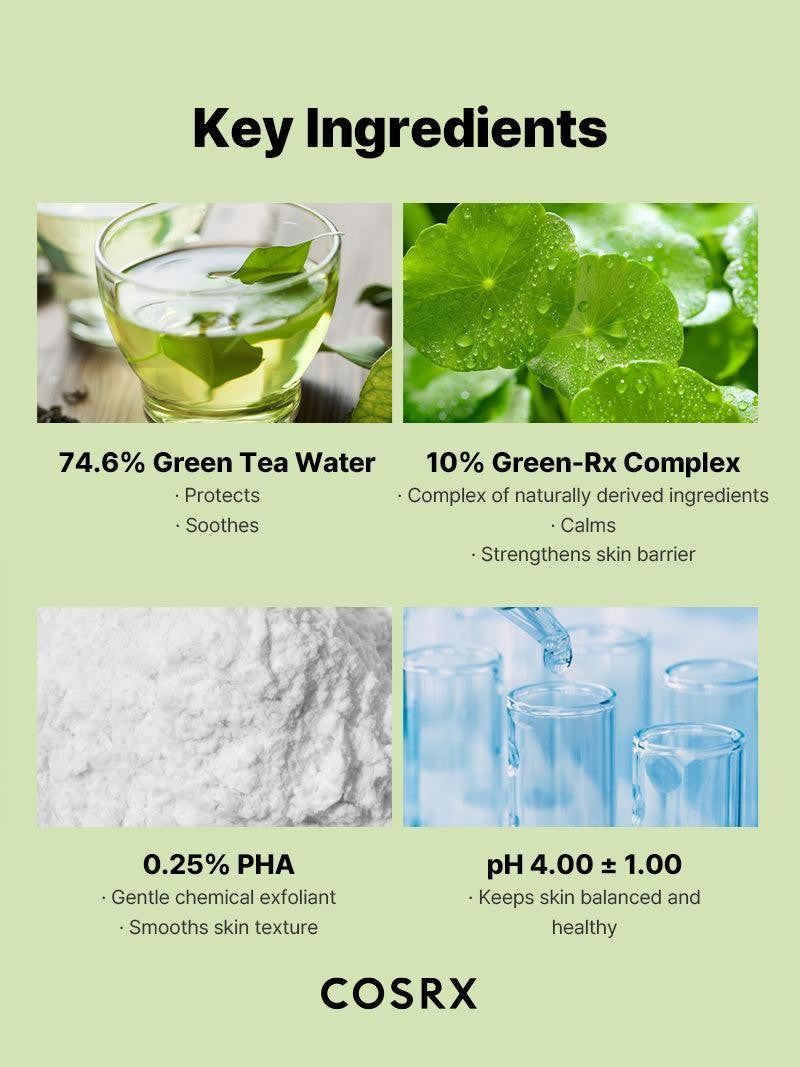 Camellia Sinensis Leaf Water, Butylene Glycol, 1,2-Hexanediol, Centella Asiatica Extract, Hamamelis Virginiana (Witch Hazel) Leaf Extract, Melaleuca Alternifolia (Tea Tree) Leaf Extract,Artemisia Vulgaris Extract, Taraxacum Officinale (Dandelion) Leaf Extract,1,2-Hexanediol,Butylene Glycol,1,2-Hexanediol,Allantoin,Panthenol,Arginine,Sodium Hyaluronate,Lactobionic Acid,Glycerin,Polyglyceryl-10 Laurate,Polyglyceryl-10 Myristate,Asiaticoside, Asiatic Acid,Madecassic Acid,Mentha Haplocalix Extract,Menthyl Lactate,Citrus Aurantium Bergamia (Bergamot) Fruit Oil,Limonene,Linalool