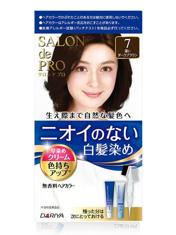DARIYA's Salon de Pro Cream Hair Color is a Japanese hair dye formulated to cover gray hair effectively. It features a cream-type formula that spreads smoothly without dripping, ensuring even application. The product is designed to be odorless, providing a more pleasant hair coloring experience.