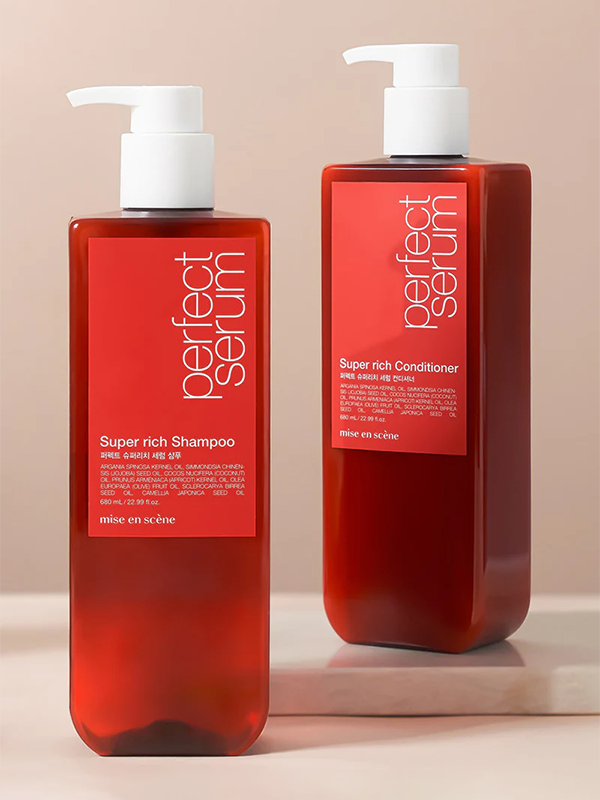 After shampooing with MISE EN SCENE Perfect Serum Shampoo, apply an adequate amount of conditioner to wet hair.