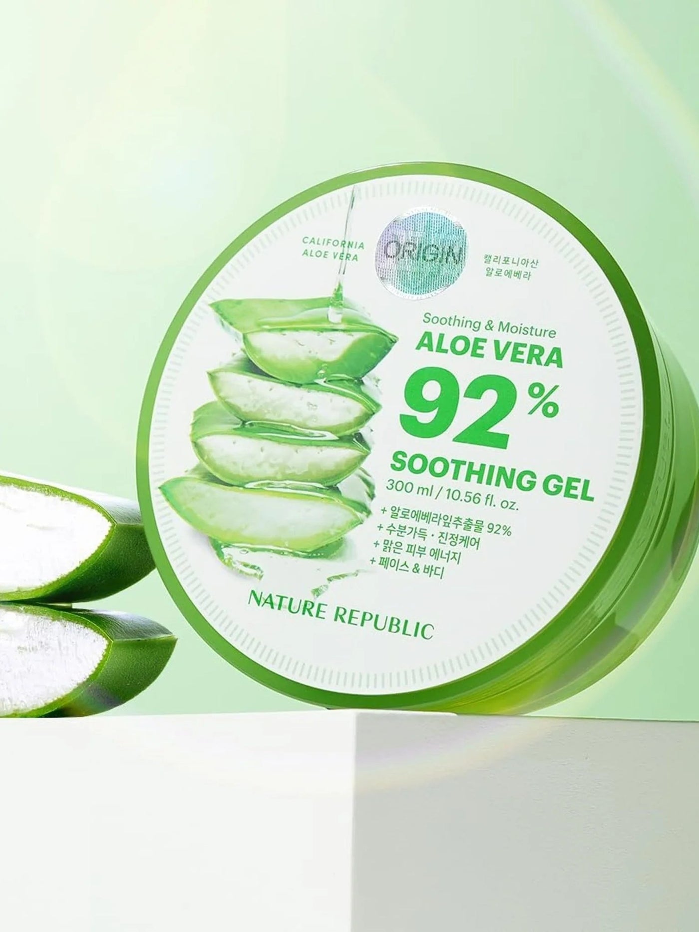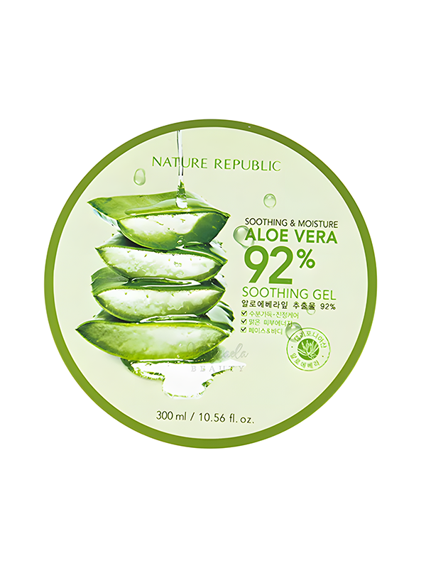 NATURE REPUBLIC's Aloe 92% Soothing Gel is a versatile, hydrating gel formulated with certified organic Aloe Vera. Perfect for moisturizing and refreshing the face, arms, legs, and hair without any sticky residue. Enjoy the benefits of nature's calming and nourishing properties with this soothing gel.