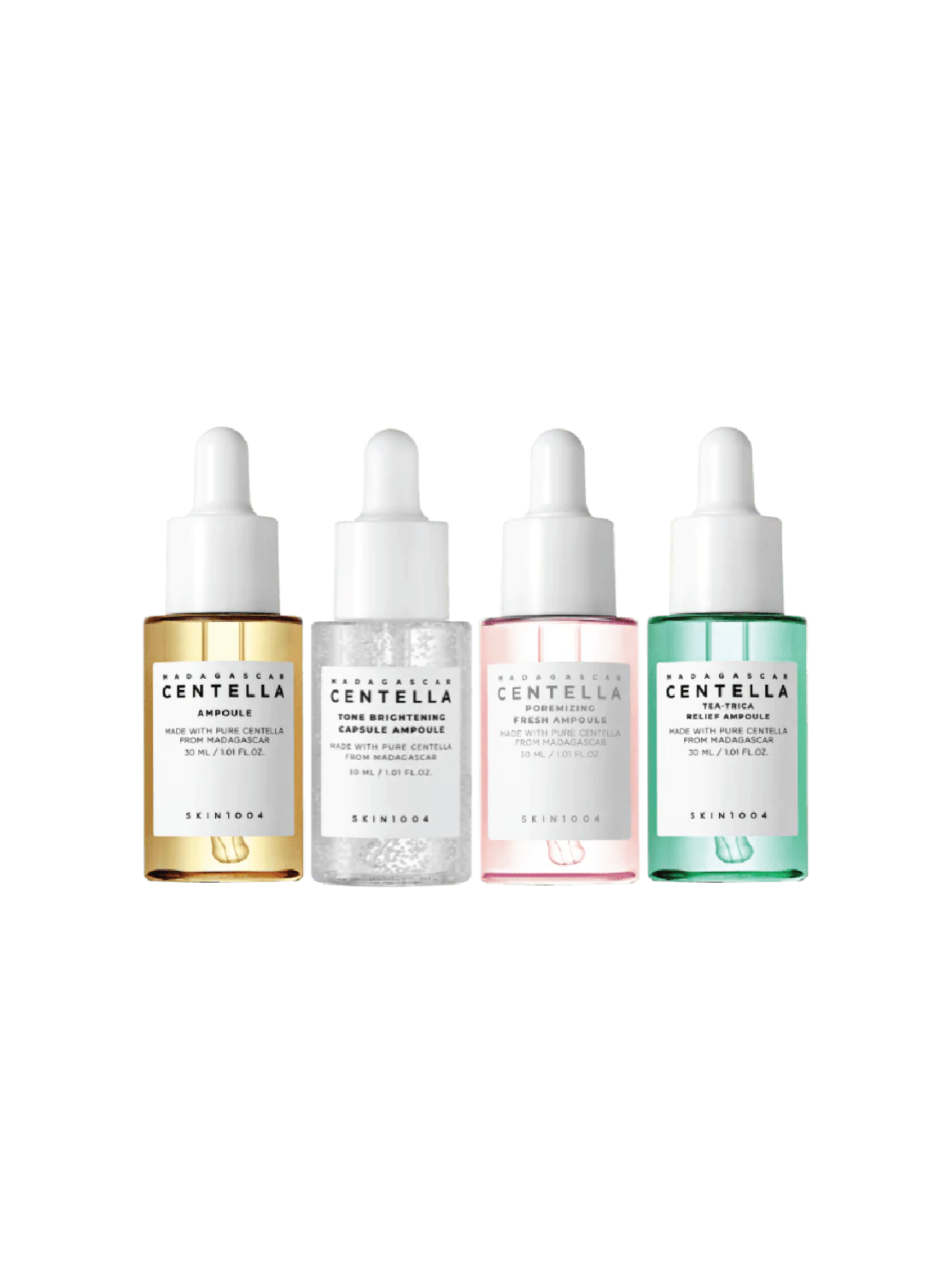 Pamper your skin with this Madagascar Centella Ampoule Kit containing four mini-sized ampoules targeting different skin concerns. The Centella Ampoule soothes and repairs damaged skin. The Tone Brightening Capsule Ampoule evens skin tone for a radiant finish. The Poremizing Fresh Ampoule minimizes enlarged pore. The Tea-Trica Relief Ampoule calms irritation and treats acne. Take a few drops of the ampoule and gently apply on face.