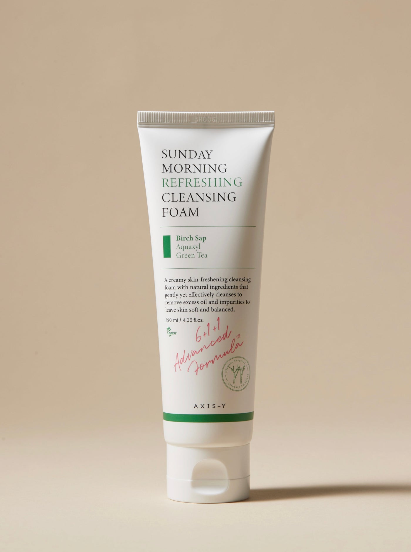 AXISY Sunday Morning Refreshing Cleansing Foam deep cleans and purifies your skin without stripping away natural moisture. Our special pH 5.5 formula features our patent skincare technology, Aquaxyl, plus additional moisturizing agents like birch sap, perilla leaf extract, rice bran, and heartleaf. Result: a clean, balanced, and hydrated complexion.