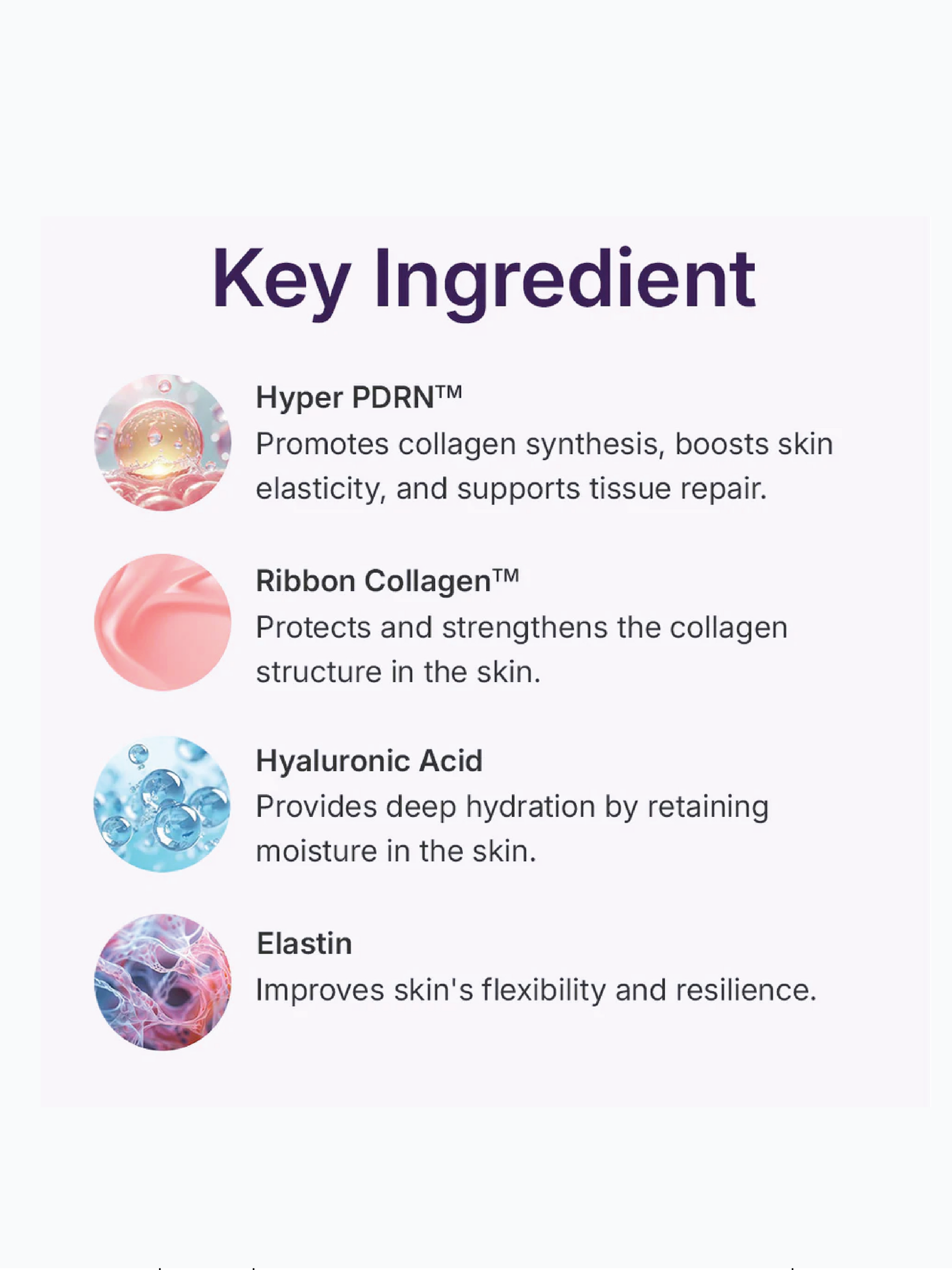 With Hyper PDRN and Ribbon Collagen, a Layered Elastic Barrier with Just One Use: One application improves elasticity up to 10 layers of skin and provides 24-hour lasting firmness while helping to repair the damaged skin barrier for firmer and healthier skin.