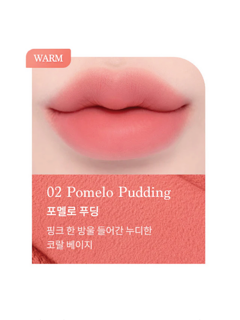 02 Pomelo Pudding: Dimethicone, Dimethicone Crosspolymer, Tribehenin, Diisostearyl Malate, Titanium Dioxide (CI 77891), Vinyl Dimethicone/Methicone Silsesquioxane Crosspolymer, Polyglyceryl-2 Triisostearate, Lauryl Polyglyceryl-3 Polydimethylsiloxyethyl Dimethicone, Barium Sulfate, Polyhydroxystearic Acid, Lecithin, Ethylhexyl Palmitate, Isopropyl Myristate, Isostearic Acid, Polyglyceryl-2 Diisostearate, Polyglyceryl-3 Polyricinoleate, Caprylyl Glycol, Glyceryl Caprylate, Disteardimonium Hectorite, Magnesium Myristate, Triethyl Citrate, Tocopherol, Benzyl Benzoate, Fragrance(Parfum), Anise Alcohol, Yellow 6 Lake (CI 15985), Yellow 5 Lake (CI 19140), Red 7 Lake (CI 15850), Iron Oxides (CI 77499)