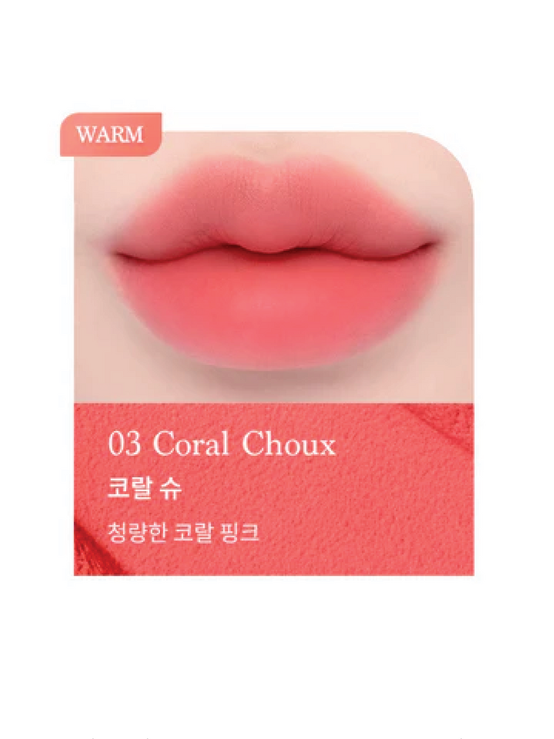 03 Coral Choux Dimethicone, Dimethicone Crosspolymer, Tribehenin, Diisostearyl Malate, Titanium Dioxide (CI 77891), Vinyl Dimethicone/Methicone Silsesquioxane Crosspolymer, Polyglyceryl-2 Triisostearate, Yellow 5 Lake (CI 19140), Lauryl Polyglyceryl-3 Polydimethylsiloxyethyl Dimethicone, Barium Sulfate, Polyhydroxystearic Acid, Lecithin, Polyglyceryl-2 Diisostearate, Ethylhexyl Palmitate, Isopropyl Myristate, Isostearic Acid, Polyglyceryl-3 Polyricinoleate, Caprylyl Glycol, Glyceryl Caprylate, Disteardimonium Hectorite, Magnesium Myristate, Triethyl Citrate, Tocopherol, Benzyl Benzoate, Fragrance(Parfum), Anise Alcohol, Red 6 (CI 15850), Red 7 Lake (CI 15850)