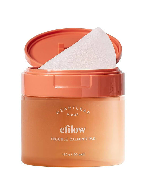 The EFILOW Heartleaf Biome Trouble Calming Pad is a skincare product designed to soothe and hydrate sensitive skin. Each container includes 100 pads, each infused with a calming essence to enhance skin health.