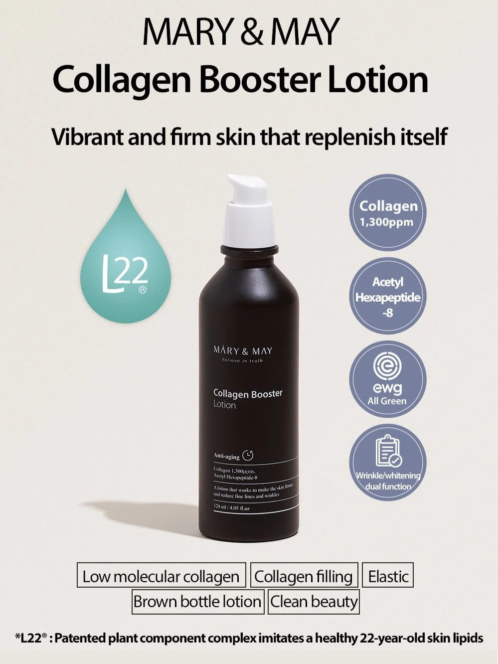 Introducing MARY&MAY Collagen Booster Lotion, the lightweight and nourishing moisturizer that enhances skin elasticity and hydration. Enriched with collagen and hydrating ingredients, this lotion gently firms and softens skin while providing long-lasting moisture. Suitable for all skin types, it's the perfect choice for a youthful, revitalized complexion. Dermatologist-tested and formulated with EWG Green Grade ingredients.