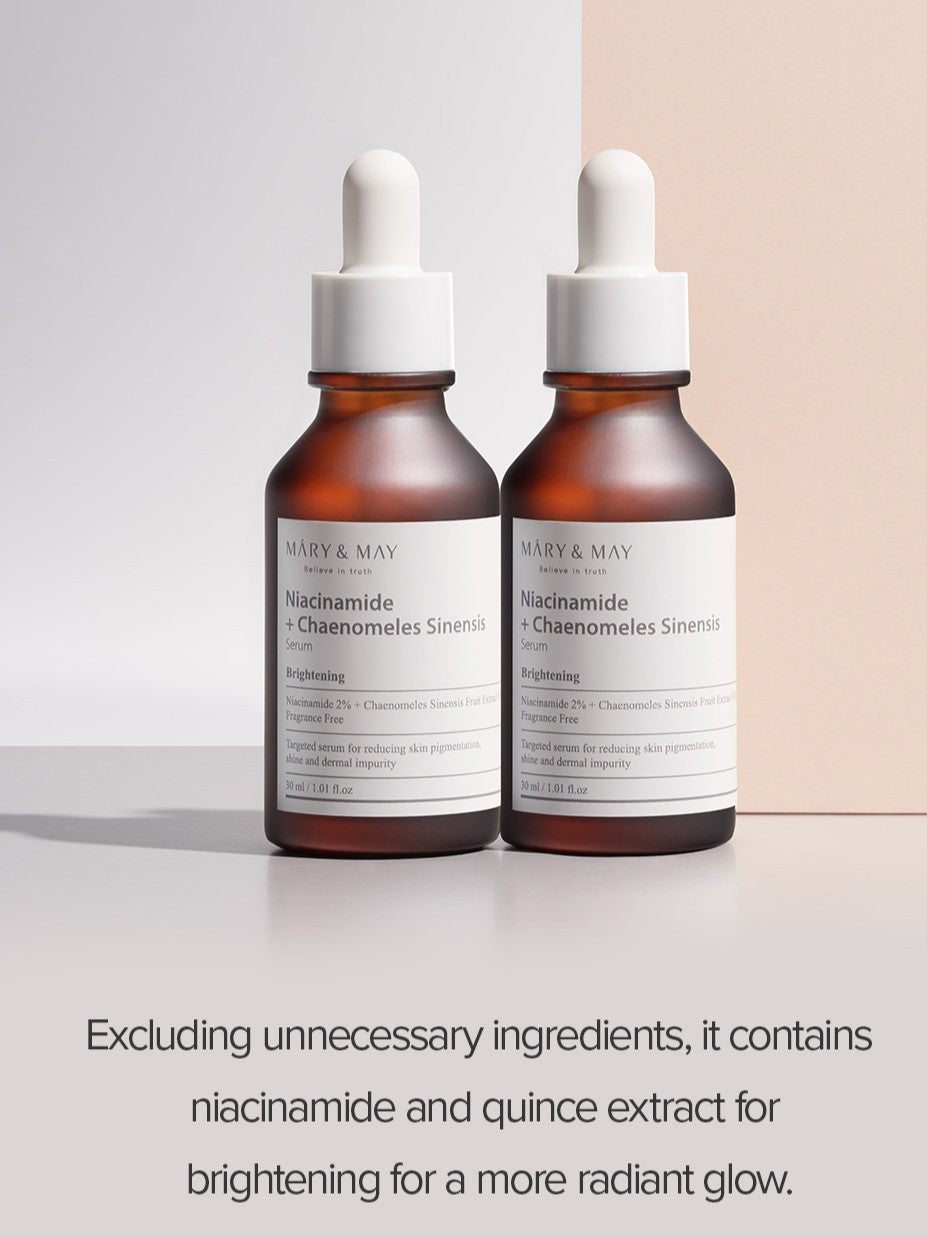 Enhance your skin's radiance with MARY&MAY's Niacinamide + Chaenomeles Sinensis Fruit Serum. Infused with 2% Niacinamide and 93% Chaenomeles Sinensis extract, this gentle serum brightens and evens out skin tone while reducing pores and soothing irritation. Its lightweight, quick-absorbing formula delivers a hydrated and refreshed complexion. EWG Green Grade-certified.